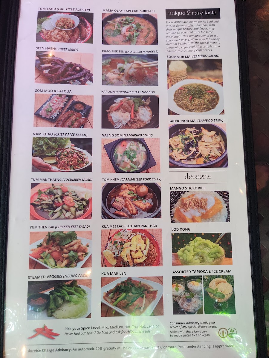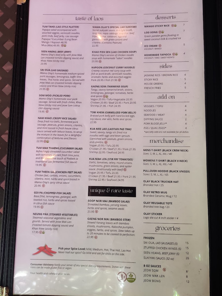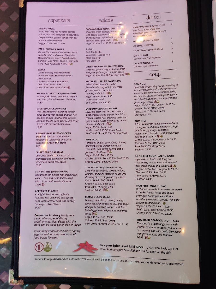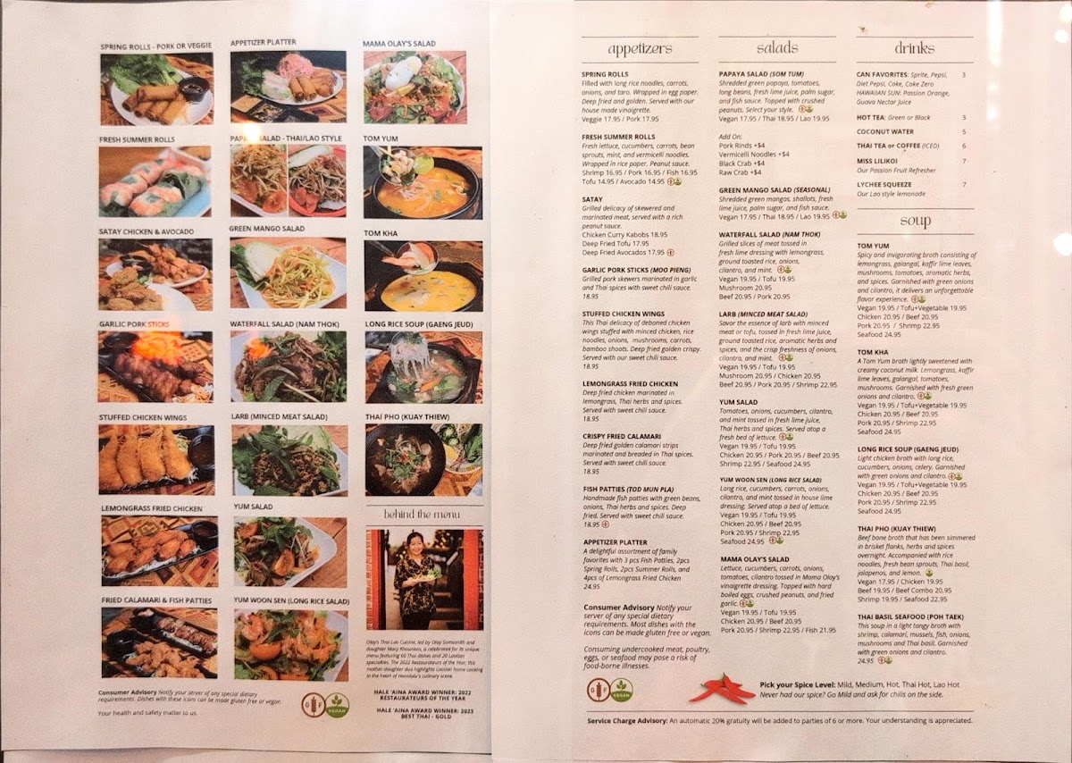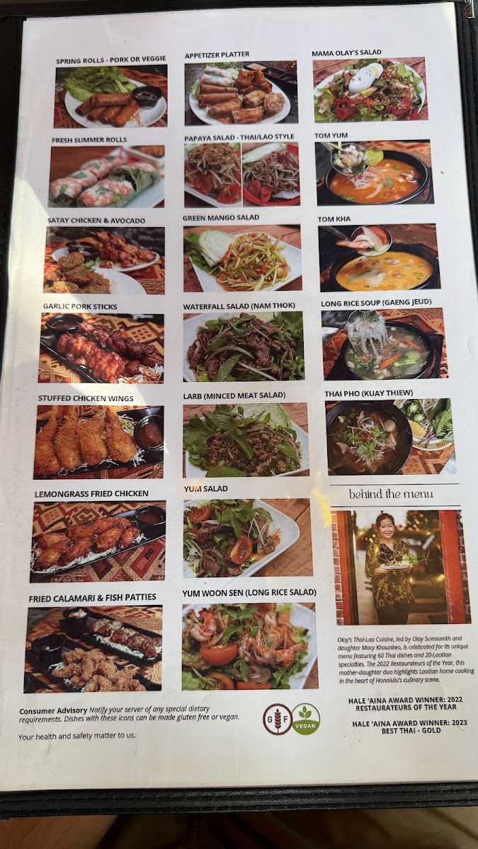 When you step into Olay's Thai Lao Cuisine, you're in for an authentic, flavorful experience that transports you straight to Southeast Asia. Nestled at 66 N Hotel St, Honolulu, HI, this cozy spot offers a vibrant mix of traditional Thai and Lao dishes, each brimming with bold flavors and fresh ingredients. The menu at Olay's Thai Lao Cuisine is a delightful journey, featuring everything from savory curries to aromatic stir-fries, each dish crafted with care and attention to detail. Whether you're in the mood for a spicy Pad Thai, a comforting bowl of Tom Yum soup, or a flavorful Laotian grilled chicken, there's something to satisfy every craving. Bold spices, zesty herbs, and vibrant colors make every meal a feast for the senses. Dive into Olay's Thai Lao Cuisine Menu and discover the taste of authenticity in every bite.